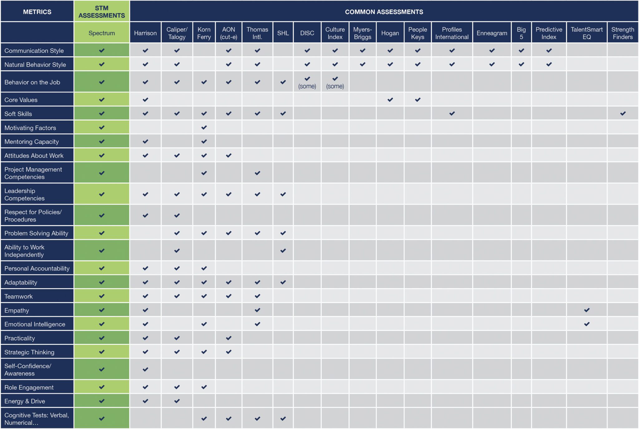 We combine validated tools with expert analysis and coaching, ensuring that results translate into practical business decisions. STM assessment tools go much deeper than the common behavior and personality assessments—we provide 97 unique metrics for each person assessed.